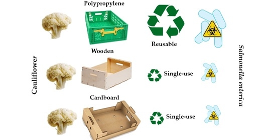 The handling of fresh fruits and vegetables in reusable plastic crates (RPCs) has the potential to increase the sustainability of packaging in the fresh produce supply chain. However, the utilization of multiple-use containers can have consequences related to the microbial safety of this type of food. The present study assessed the potential cross-contamination of fresh cauliflowers with Salmonella enterica via different contact materials (polypropylene from RPCs, corrugated cardboard, and medium-density fiberboard (MDF) from wooden boxes). Additionally, the survival of the pathogenic microorganism was studied in cauliflowers and the contact materials during storage. The life cycle assessment (LCA) approach was used to evaluate the environmental impact of produce handling containers made from the different food-contact materials tested. The results show a higher risk of cross-contamination via polypropylene compared with cardboard and MDF. Another outcome of the study is the potential of Salmonella for surviving both in cross-contaminated produce and in contact materials under supply chain conditions. Regarding environmental sustainability, RPCs have a lower environmental impact than single-use containers (cardboard and wooden boxes). To exploit the potential environmental benefits of RPCs while ensuring food safety, it is necessary to guarantee the hygiene of this type of container. View Full-Text