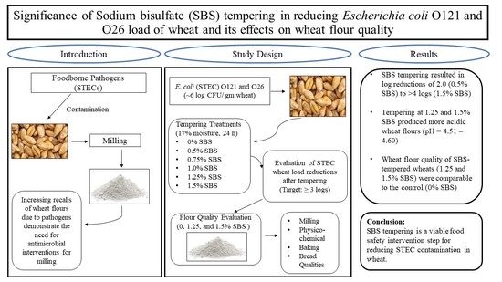 The occurrence of recalls involving pathogenic Escherichia coli-contaminated wheat flours show the need for incorporating antimicrobial interventions in wheat milling. The objectives of this study were to assess the efficacy of sodium bisulfate (SBS) tempering in reducing E. coli O121 (ATCC 2219) and O26 (ATCC 2196) wheat load and to evaluate the impact of effective (≥3.0 log reductions) SBS treatments on wheat flour quality. Wheat grains were inoculated with E. coli (~6 log CFU/g) and tempered (17% moisture, 24 h) using the following SBS concentrations (%wheat basis): 0, 0.5, 0.75, 1.0, 1.25, and 1.5% SBS. Reductions in E. coli O121 and O26 wheat load at different time intervals (0.5, 2, 6, 12, 18, and 24 h) during tempering were evaluated. The addition of SBS during tempering resulted in E. coli (O121 and O26) log reductions of 2.0 (0.5% SBS) to >4.0 logs (1.5% SBS) (p ≤ 0.05). SBS tempering (1.25 and 1.5% SBS) produced acidic wheat flours (pH = 4.51–4.60) but had comparable wheat flour properties in terms of composition, dough, and bread-making properties relative to the control (0% SBS). SBS tempering reduced the E. coli O121 and O26 load of wheat after tempering with minimal effects on wheat flour quality. View Full-Text