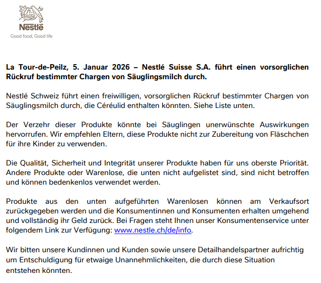 Food Public Warning: Voluntary Withdrawal of Certain Infant Formula Products (Update of 07.01.2026)
