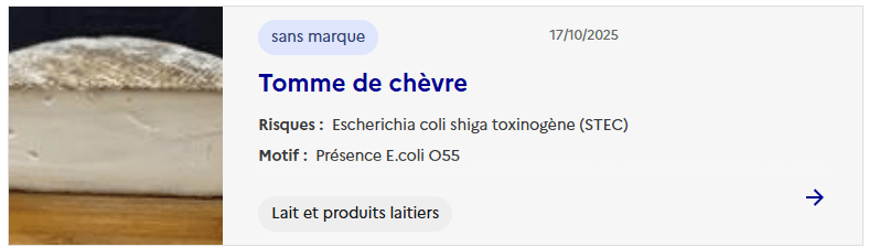 Alerta por presencia de Escherichia coli productor de toxina Shiga (STEC) en queso procedente de Francia. (Ref. ES2025/608)